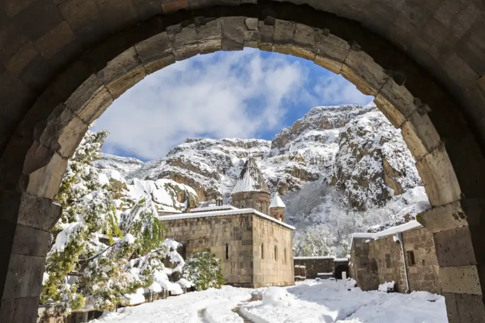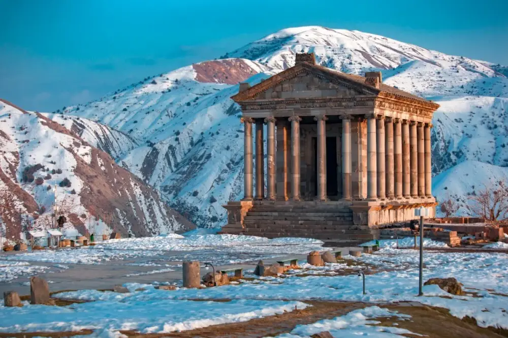 The journey continues eastward to the UNESCO-listed Geghard Monastery, partially carved into towering cliffs and rich in medieval heritage. Next comes a visit to the pagan Temple of Garni, a rare Hellenistic monument set dramatically above the Azat River Gorge.